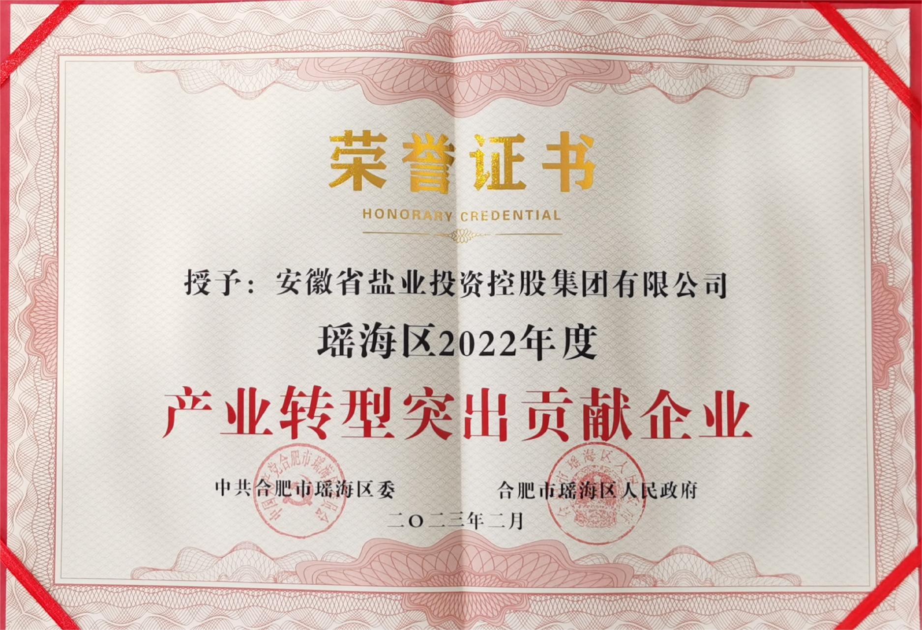 近日,省盐业币博网站获得瑶海区委、区政府授予的瑶海区2022年度“产业转型突出贡献企业”荣誉称号。