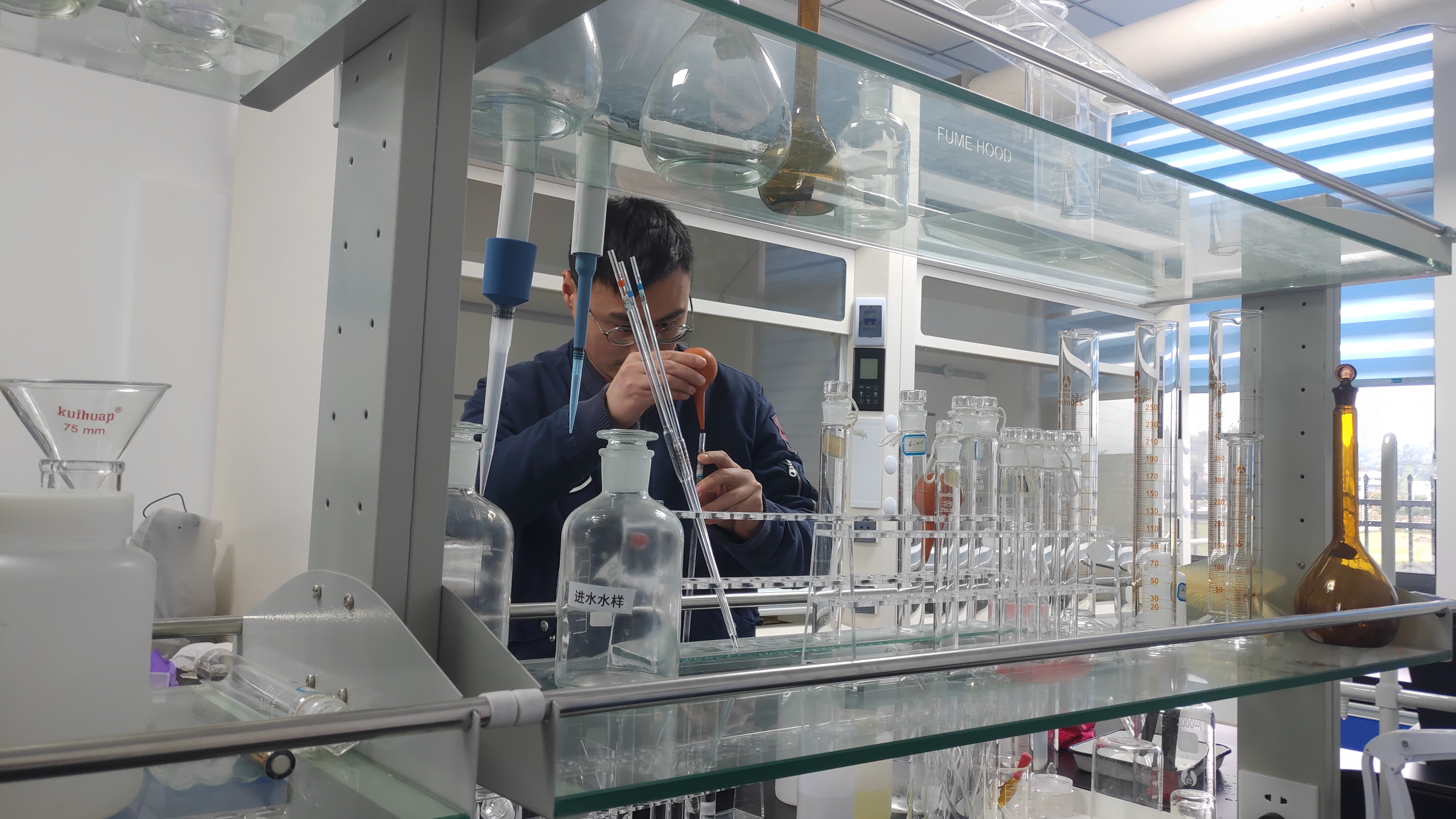 (上图为检测员正在对污水处理厂进水水质进行检测)