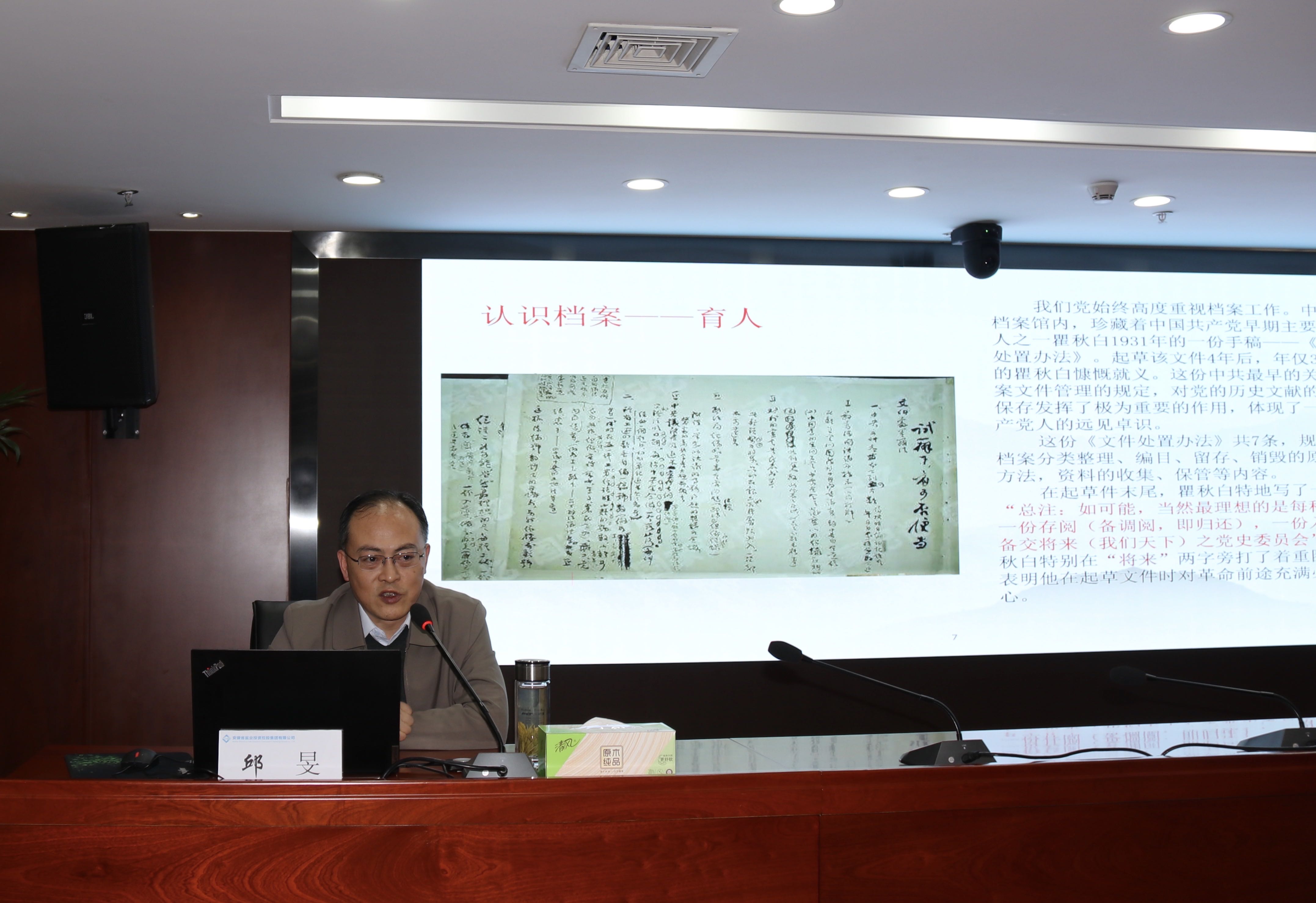 本次培训邀请到省委办公厅档案管理一处处长、一级调研员邱旻,为大家作“强化法治思维提升企业档案工作规范化管理水平”专题授课。课程围绕习近平总书记对档案工作重要批示指示精神,解读新修订的档案法内容与特点,就如何落实档案工作责任制、健全档案管理相关制度、明确归档范围和保管期限、推动档案开放与利用、加强档案信息化建设等进行辅导。本次培训主题鲜明、内容丰富、事例生动、旁征博引,既有理论高度、又有实践深度,具有很强的理论性,指导性和可操作性。