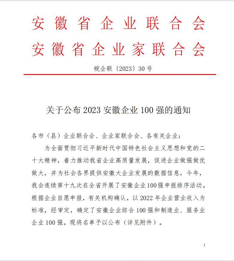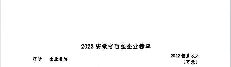 2023年11月22日,安徽省企业联合会、安徽省企业家联合会举办了2023安徽百强企业发布会暨企业家论坛,现场发布了“2023安徽省百强企业”榜单,及“2023安徽省制造业百强企业 ”“2023安徽省服务业百强企业”榜单。该活动迄今已经连续开展十九届,基本囊括了安徽营收规模排在前列的各类企业。