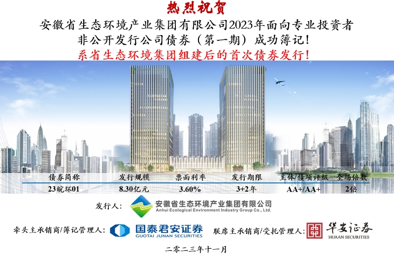 11月24日,省生态环境币博网站首单非公开公司债券(债券简称:23皖环01,债券代码:253104.SH)在上海证券交易所成功簿记发行,本次债券由国泰君安、华安证券主承销,募集金额8.3亿元,期限3+2年,票面利率3.60%,圆满完成币博网站挂牌以后在资本市场的首次亮相。