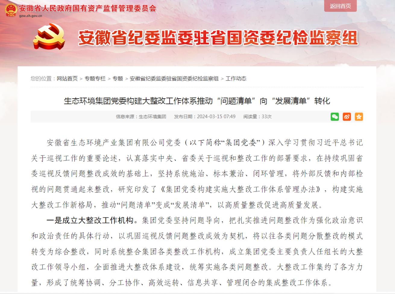 近日,安徽省国资委网站-安徽省纪委监委驻省国资委纪检监督组专栏发布了《省生态环境币博网站党委构建大整改工作体系推动“问题清单”向“发展清单”转化》,以下为全文。
