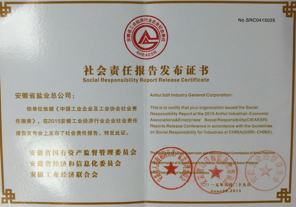 日前,在由安徽省国资委牵头、安徽省工业经济联合会主办的“2015安徽省企业社会责任报告发布会”上,《安徽省盐业总公司2014年度社会责任报告》正式发布,这也是我公司首次对外发布社会责任报告。该责任报告较全面、客观的披露了安徽盐业践行国企职责、认真履行社会责任的总体情况,充分体现了安徽盐业服务社会和广大消费者的责任感和使命感。