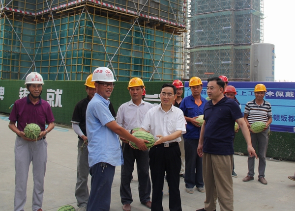 王思军顶着烈日、冒着酷暑来到六安项目在建工地,与施工人员亲切交谈,详细了解防暑降温工作保障情况,将绿豆、西瓜、毛巾、清凉油等防暑降温物品送到一线职工手中,希望各参建单位通力合作,全力实现人员安全、施工安全和质量安全。