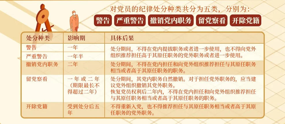 《中国共产党纪律处分条例》规定,对党员的纪律处分种类共分为五类,分别为警告、严重警告、撤销党内职务、留党察看和开除党籍。
