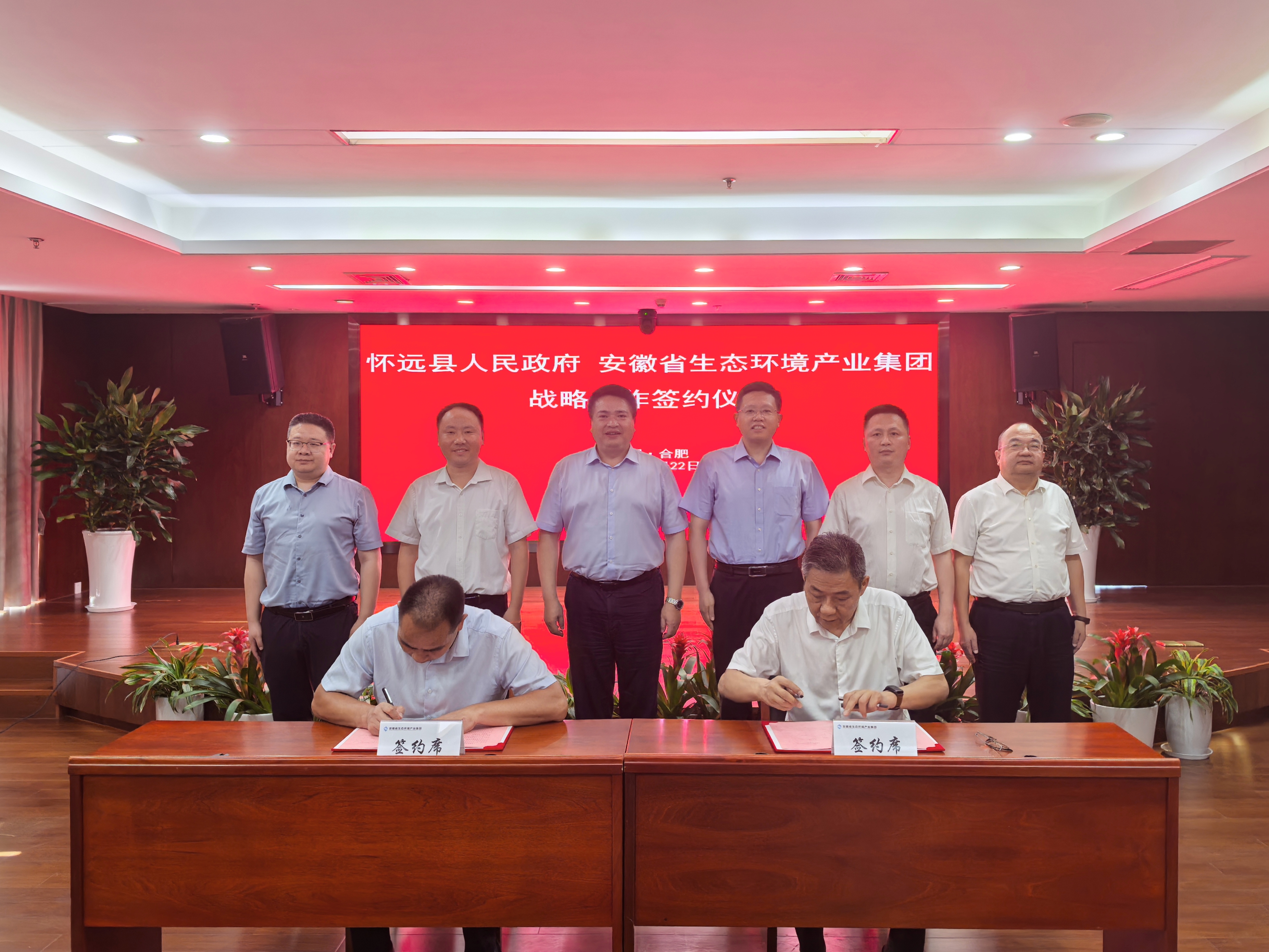 7月22日,省生态环境产业币博网站与怀远县签署战略合作协议。省生态环境产业币博网站党委书记、董事长罗太忠与蚌埠市委常委、怀远县委书记潘君齐出席签约仪式并见证签约。
