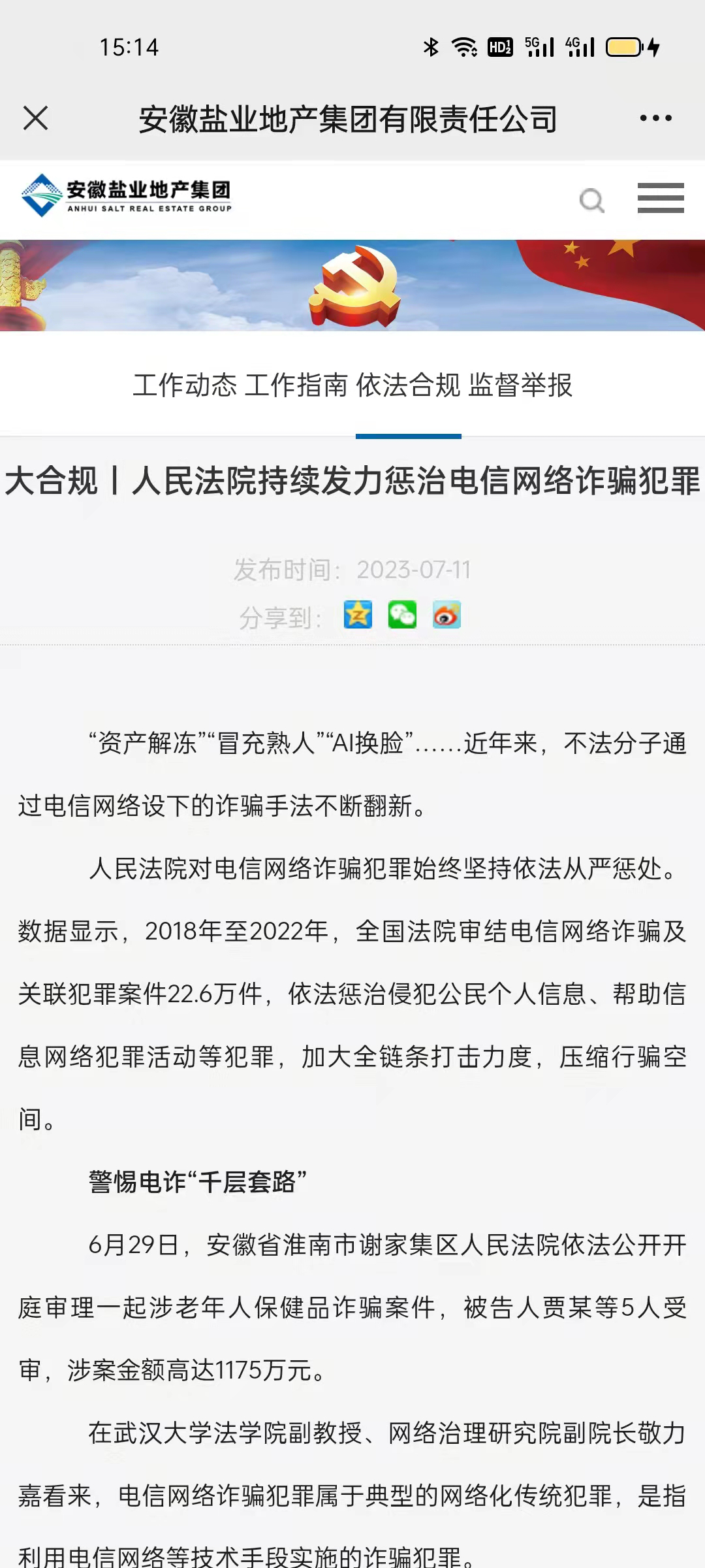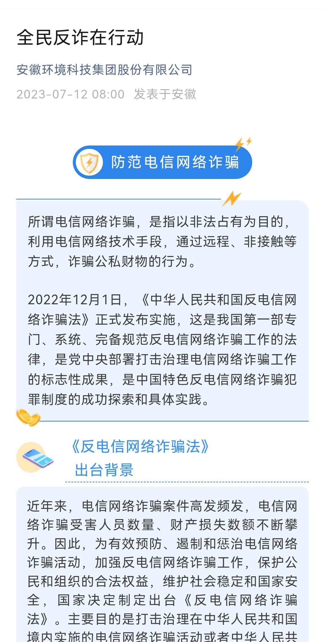 环境科技币博网站、省健康养老、徽盐金融等公司通过印制各类反诈宣传单、宣讲防范电信诈骗安全知识,在公众号发表普法文章等形式,号召全体员工增强防范意识。