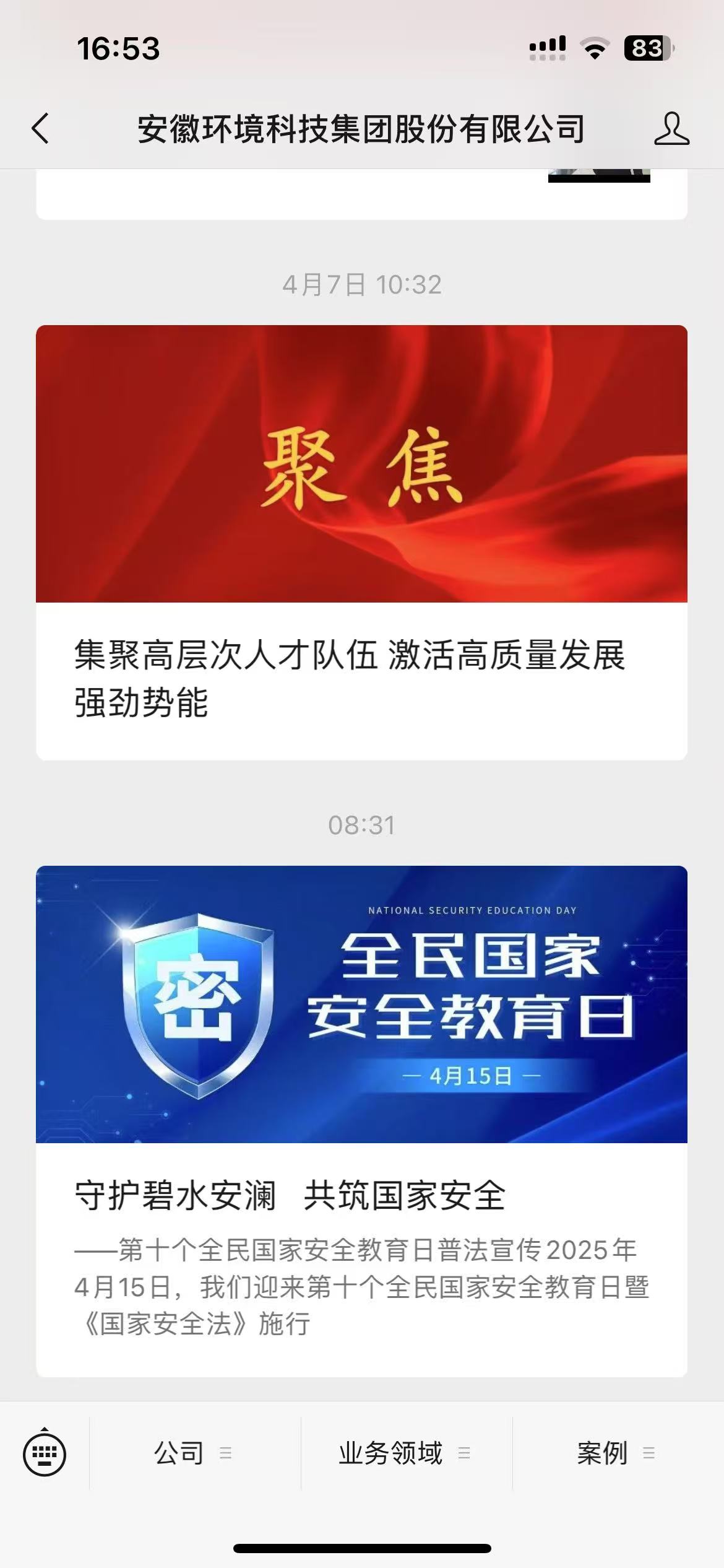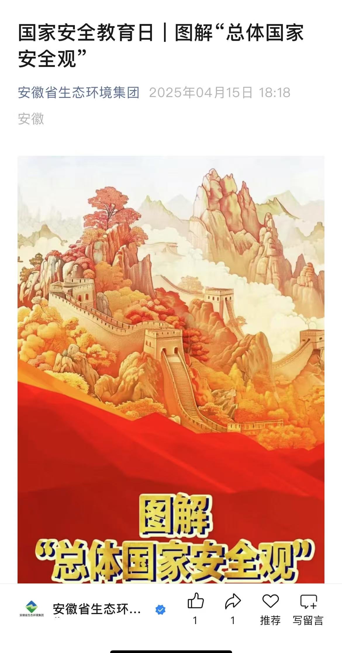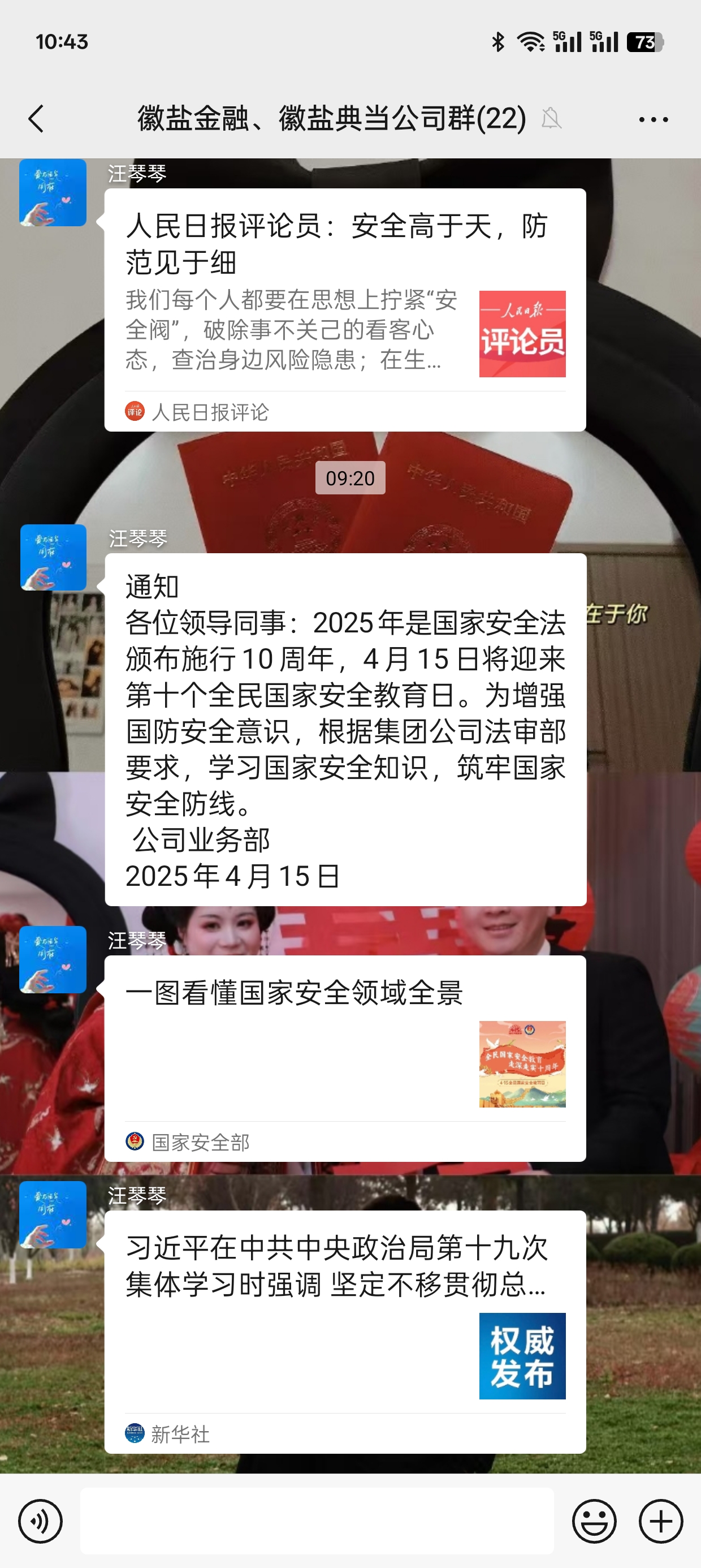地产币博网站微信群每日推送国家安全知识图解、微视频,以“碎片化学习”提升普法渗透力;币博网站公司、环境科技币博网站微信公众号发布专题推文《国家安全,你我同行》,通过案例剖析、法条链接等形式,生动解读《国家安全法》《反间谍法》;徽盐金融等子公司组织线上答题活动,覆盖全员,以考促学巩固国家安全基础知识,参与率达100%。