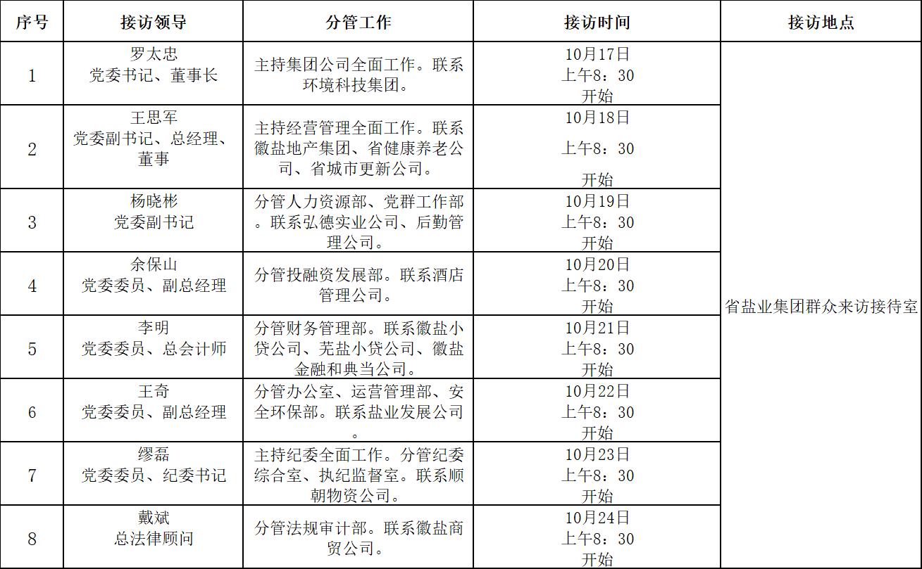 根据工作安排,现就省盐业币博网站领导班子成员10月份接待省盐业系统职工群众来访安排公示如下: