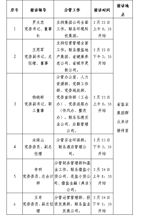 根据工作安排,现就省盐业币博网站领导班子成员2月份接待省盐业系统职工群众来访安排公示如下: