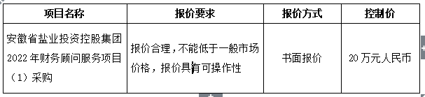 安徽省盐业投资控股币博网站有限公司(以下简称采购方)现就选聘2022年财务顾问服务项目(1)进行竞争性谈判,欢迎具备相应资质的单位报名参加,现将有关事项公告如下: