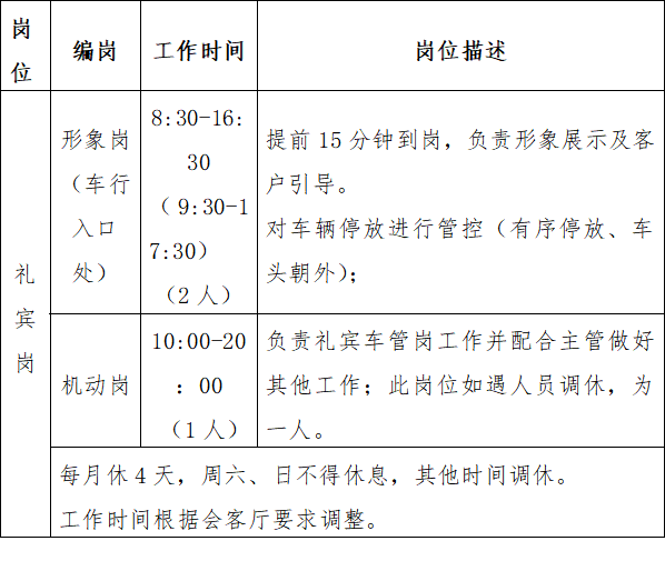 (3)客服岗:选派的客服人员必须经过专业技能培训,身体健康,品行良好,无违法违纪犯罪前科,具有初中以上文化程度,年龄在21至45周岁、身高1.65米以上。对现场的客户接待服务工作有一定的意识。
